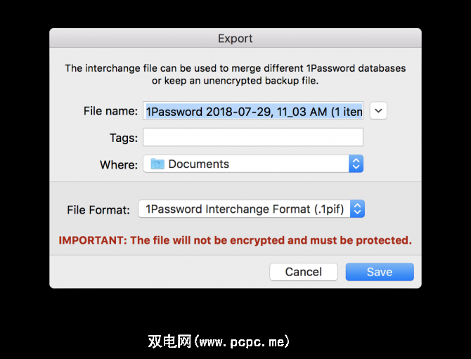 系统会提示您输入密码以继续。在打开的对话框中,您可以选择文件名,格式并选择保存密码的文件的位置。对于格式,选择.pif。 (1Password警告您,该文件不会被加密,因此请确保安全。)