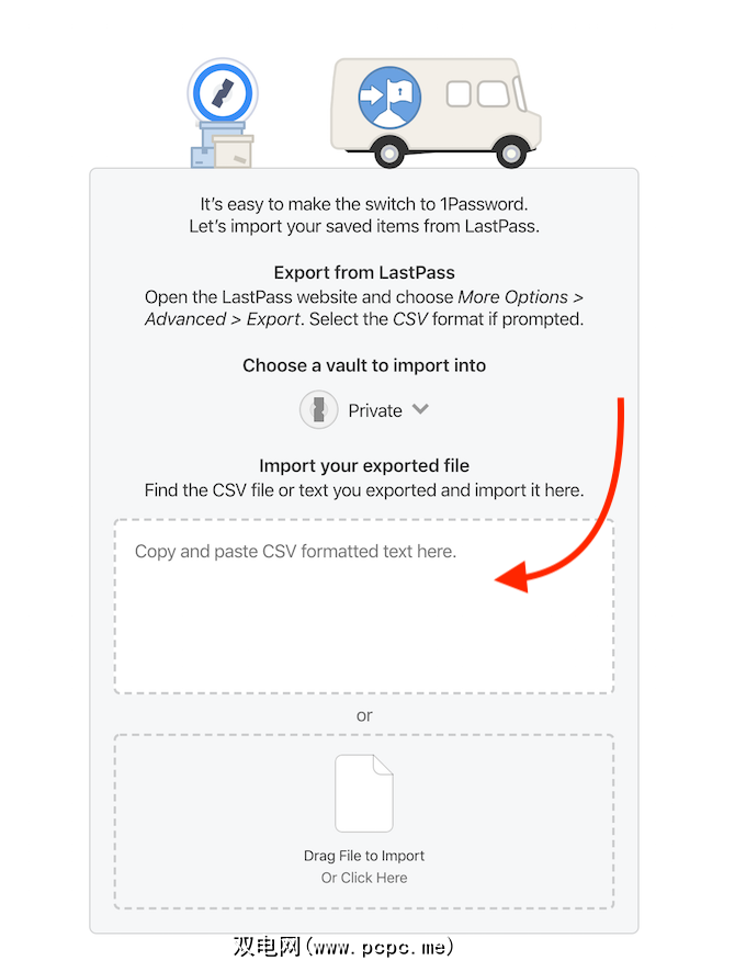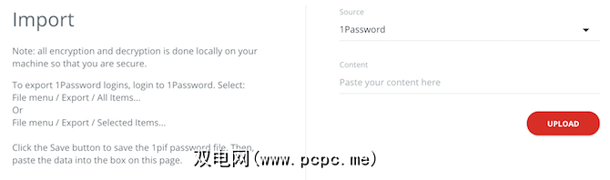 在打开的窗口中,对于 Source ,从下拉菜单中选择 1Password 。打开使用所选浏览器下载的pif文件。您可以通过打开一个新标签页并将pif文件拖到空白标签页中来快速完成此操作。使用键盘快捷键 Ctrl / Cmd + A 选择所有数据,然后< strong> Ctrl / Cmd + C 进行复制。在LastPass导入窗口中,将该数据粘贴到 Content 字段中。![]()