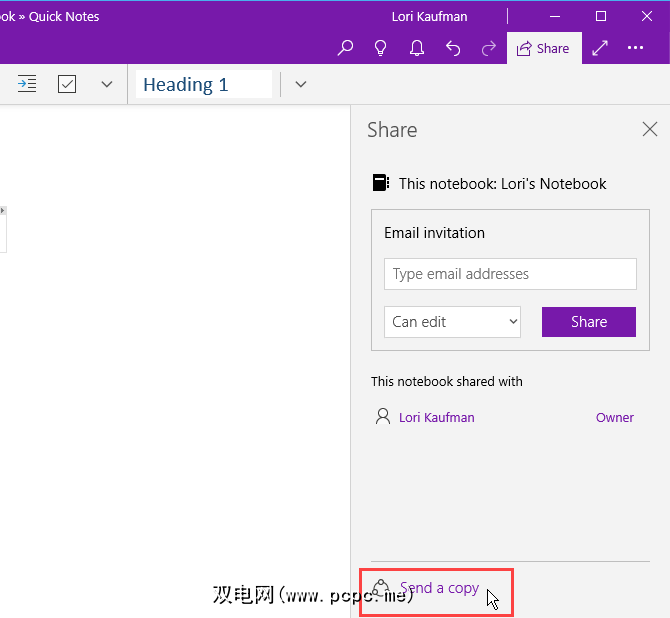 打开要共享的笔记,然后单击OneNote窗口右上角的 Share 。然后,单击发送副本。
