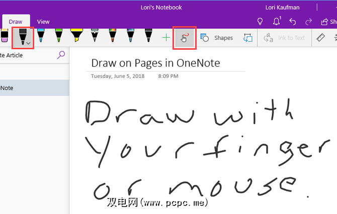 您可以使用Surface触控笔(如果有Surface)在笔记中画图或草绘,或者如果触摸PC则可以用手指画图或草绘屏幕。如果没有触摸屏或Surface,则仍然可以使用鼠标进行绘制。
