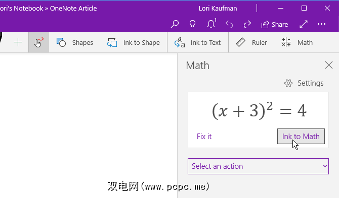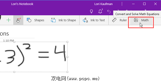 要将手写的方程式转换为键入的方程式,请在数学窗格上单击将墨水转换为数学。