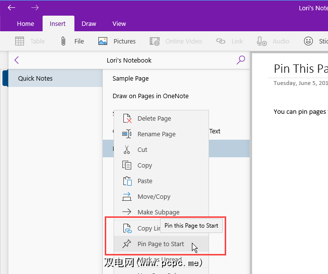 该页被添加为“开始"菜单上的图块。单击图块以在OneNote中打开笔记。