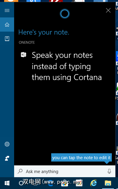 说出要添加到您的笔记中的内容注意。 Cortana会将您所说的内容转换为文本并显示出来。同样,单击转换后的文本以在OneNote中打开笔记。