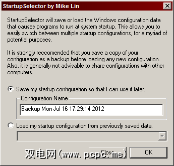 启动应用程序后,您会看到为您方便地预先填充了当前启动配置的描述。如果您想更加安全,并快速保存当前配置,只需点击确定按钮。否则,您可以将其重命名为所需的名称。请注意,StartupSelector不支持删除这些配置的功能,如果您应该这么做的话。
