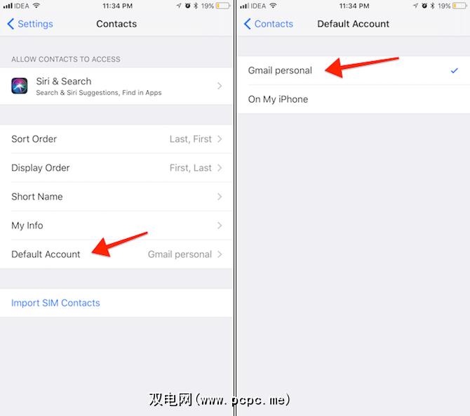 第4步:在设置中的联系人部分中strong>,请转到默认帐户部分,并将其切换到您的Google帐户。