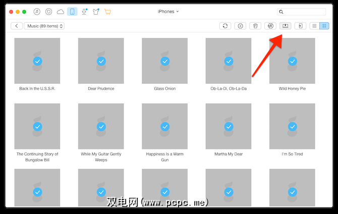 第4步:您会在此处看到所有音乐。选择所有歌曲,然后从工具栏中,单击发送到Mac (或发送到PC )按钮。
