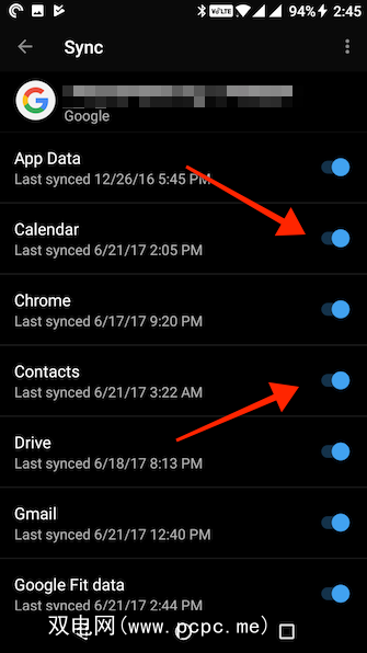 第3步:登录后,请确保联系人 >和日历同步已启用。