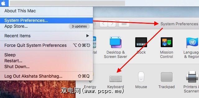 如果您希望Mac上的 ctrl 键的功能类似于Windows计算机上的ctrl键,我们建议交换 cmd的功能和 ctrl 键。为此,请先单击菜单栏中左上方的Apple图标,然后转到系统偏好设置>键盘。