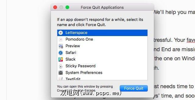 Windows上的ctrl + alt + del组合就像万灵药出现系统故障。那是因为它启动了任务管理器,使您可以强制关闭有故障的应用程序。在Mac上,您可以通过以下按键组合打开任务管理器: cmd + option + esc。