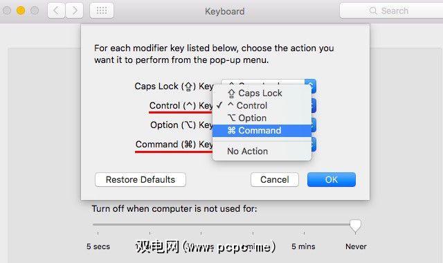 在随后出现的对话框中,从下拉菜单中选择 Command 。到C 控制(^)键:,然后在 Command Key 键旁边的下拉菜单中选择 ^ ctrl 。点击确定,完成更改。这样可以交换两个键的功能,因此您不必担心将 cmd 替换为ctrl,同时又将自己喜欢的Windows快捷方式带到Mac。