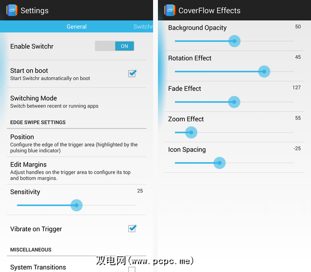 上面,您可以看到Switcher Flow的两种不同外观。敏锐的读者会在右边的屏幕截图中看到CoverFlow Effects面板:这是您用来调整Flow设置的屏幕,几乎可以自定义任何内容。