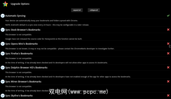 ChromeMarks Lite不提供此功能。要将ChromeMark与您的Android浏览器集成,您必须升级到该应用的完整版本。不幸的是,由于该工具无法与Android Honeycomb和某些Samsung手机上的常规浏览器集成或同步,因此部分地将Honeycomb和一些Samsung用户排除在外。但是,在冒险升级之前,您可以使用ChromeMarks Lite验证设备是否支持升级选项。