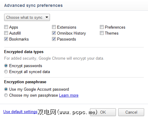 在高级同步首选项弹出窗口中,选择要同步的项目,例如>书签。完成后,点击确定。