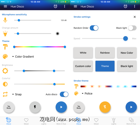 Hue Disco在移动设备上运行,并使用麦克风收听音频。这意味着无需复杂的设置或音频路由。只需将其放置在音频源附近,启动应用程序,选择要在显示屏中使用的灯光,然后点击运行即可。您可以选择更快的效果和更多的频闪效果,平滑的过渡效果,或两者兼而有之。如果只想将显示限制为万圣节风格,则还可以调整配色方案。