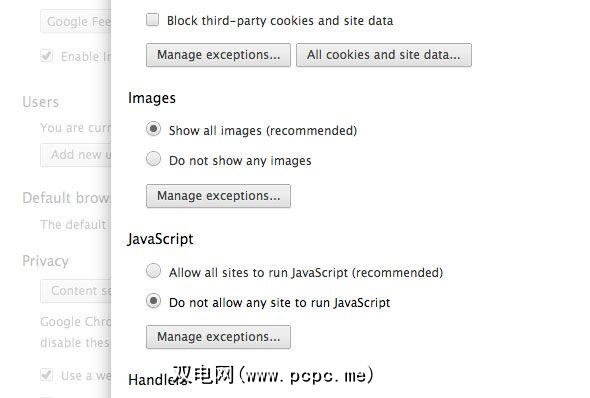 接下来,我们将(暂时)禁用JavaScript。使用Google Chrome浏览器,转到设置->高级设置->隐私->内容设置,然后选择“ 不允许任何网站运行JavaScript "(如下所示)。