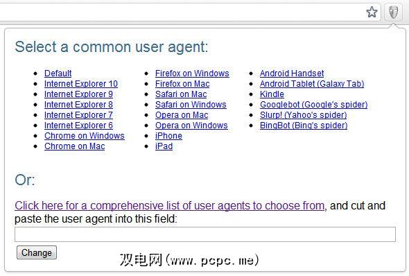 为浏览器安装用户代理切换器插件。您可以为Google Chrome使用恰当命名的User-Agent Switcher扩展名(如上图所示),或者为Mozilla Firefox使用User Agent Switcher [不再可用]附加组件。安装后,使用扩展程序或附加组件将浏览器的用户代理临时更改为iPhone或iPad的用户代理。
