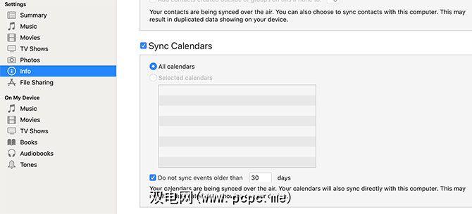如果在线同步不起作用,但您需要确实需要手机上的日历信息,您可以通过iTunes进行同步。为此,请将iPhone插入运行iTunes的Mac或PC。然后选择iPhone设备图标,然后单击左侧菜单中的信息。