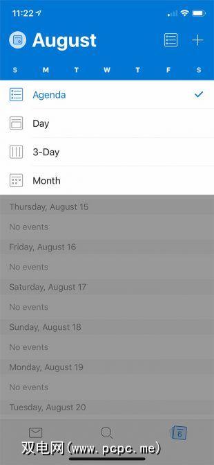 类似于Outlook for Desktop,iPhone for Outlook可以处理邮件,日历,联系人等。要进入Outlook日历,请点击屏幕底部栏上最右边的图标。通过点击屏幕顶部日期栏上方的图标,您可以从不同的视图中进行选择,包括日,三天,月或议程样式。