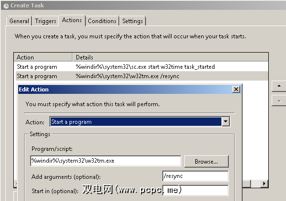 现在转到>动作标签。您必须为此任务设置两个操作。第一个确保Windows时间服务正在运行,第二个触发实际时间同步。