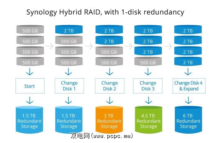 SHR的好处仅在升级两个当前驱动器后才开始。为了说明上图,在阵列的开头,您有4个500GB驱动器,其中一个用于数据冗余。因此,您的总容量为3 x 500GB。 (注意:您不需要从四个驱动器开始,并且它们不必都具有相同的大小,但这是解释Synology优势的最简单方法)。升级单个驱动器没有任何好处-因为该驱动器提供的额外存储空间无处可复制,因此在此存储数据将是不安全的。但是,每次后续驱动器升级都会立即按比例提供更多空间。在标准RAID阵列中,在升级每个驱动器之前,这些驱动器上的额外空间将是无用的。