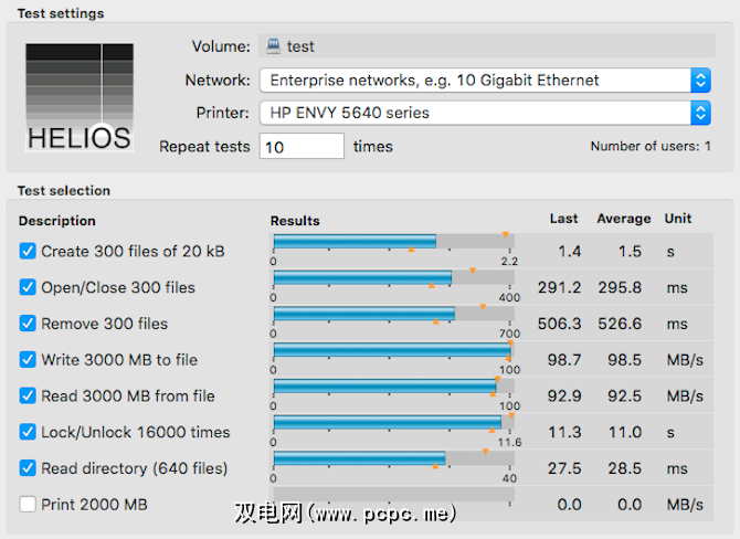 HELIOS解释了这是由于苹果使用了优化算法来逐渐增加数据包大小直到没有性能提高可以获得。上面的结果带有一个300MB的测试文件,该文件是为千兆以太网连接设计的。通过将测试参数增加到3000MB –或按照HELIOS定义的企业级10千兆网络测试–获得了明显更高的分数,与实际Finder速度更相似: