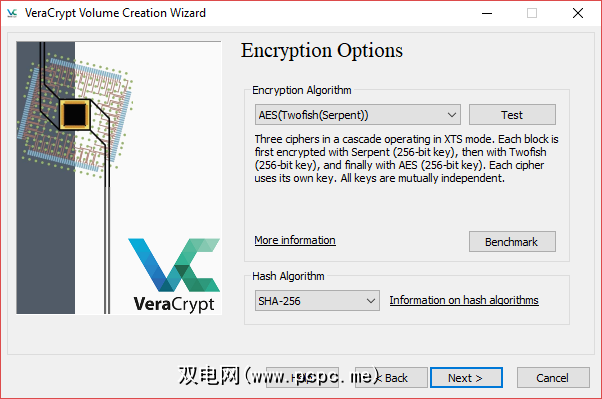 VeraCrypt提供了范围更广的加密算法,用户,包括AES,Twofish,Serpent和Camellia。此外,用户可以选择两种哈希算法之一(SHA-256或RIPEMD-160)。