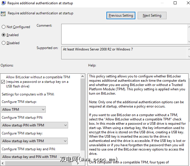 下一步,选择已启用以允许策略编辑。然后,在选项下,选择允许不兼容TPM的BitLocker 。点击应用,然后点击确定。