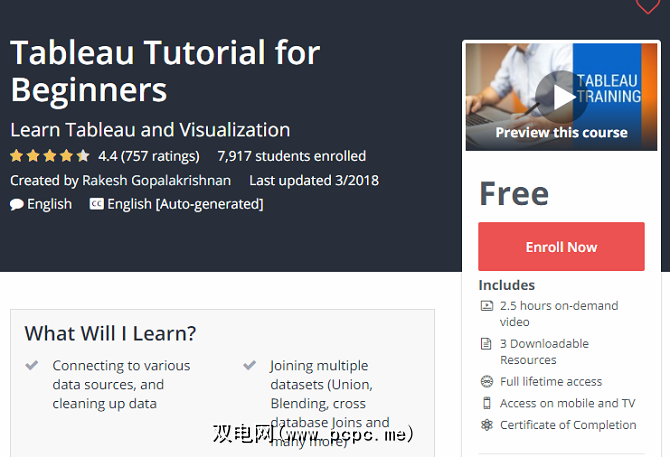 如果您是Tableau的完整入门者,则应查看此免费的Udemy课程。整个课程仅持续2.5个小时,因此不会让您长时间困扰。您将立即准备参加中级课程。