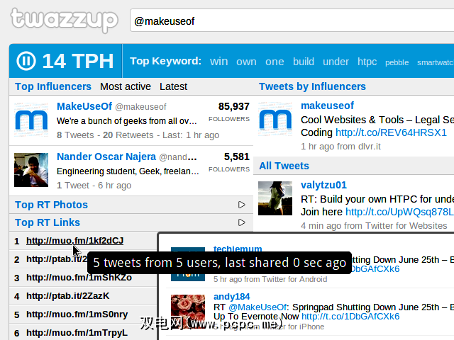 要进行测试,请使用Twitter登录到Twazzup,授权该应用程序,输入在关键字或主题标签中,然后点击 Monitor 。当我搜索 PCPC.me 时,Twazzup上班了,为我展示了一长串相关结果,并按照 Top Impactrs ,Implementrs Tweets < / em>,热门RT链接, Google新闻提醒等。该工具还显示了相关的热门关键字和标签。