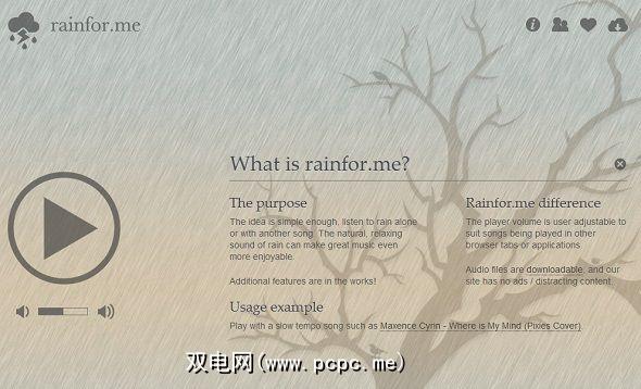 Rain For Me消除了所有视觉干扰,专注于提供我们许多人都难以置信的轻松声音。在显示简单的静止图像的背景上,上面有一片林地被水淹没,您会听到倾盆大雨的声音。如果您的口味有些沉闷,则可以打开第二个标签页或窗口并播放一些轻音乐。