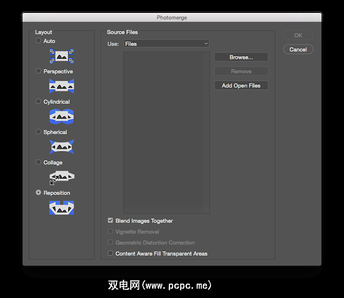 在您选择的程序中,转到文件>自动化> Photomerge 强>。将打开一个窗口,您可以在其中选择图像。如果您已经在Photoshop中打开了图像,请选择添加打开的图像。如果要浏览到包含照片的文件夹,请单击浏览。选定图片后,选择重新放置布局。