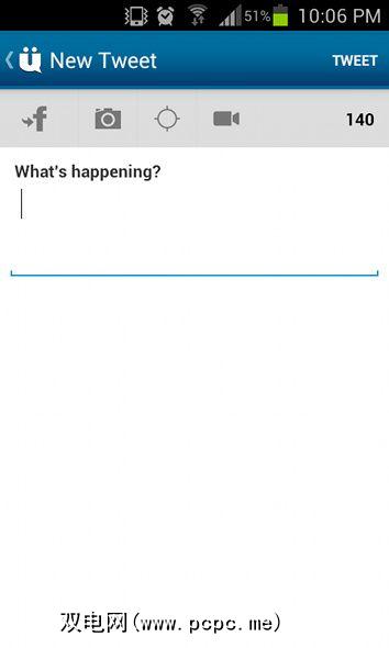 在这些操作按钮下方将是该推文的转发列表。您正在查看,或者,如果该推文具有链接,它将显示给您链接的预览。通过单击右上角的铅笔图标,撰写推文也很容易。然后,您可以键入自己的tweet,以及添加图片,视频或位置,甚至在启用后将其发布到Facebook中。