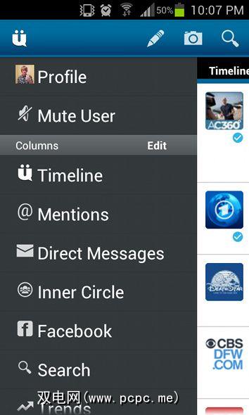 第一列和最左边的列将是您所有时间轴的您关注的人。如果您向左滑动(因此向右移动一列),您将看到在其中提及的推文。进一步滑动会将您发送至直接消息,“ Inner Circle" ,Facebook,搜索,趋势,附近的推文,转推,最后是收藏夹。