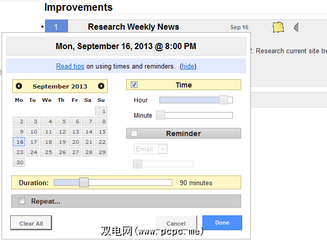 在GQueues中分配日历日期实际上与其他项目非常不同我以前见过的管理应用程序。在GQueues中,您不仅为任务分配了截止日期,还给了它一个估计的持续时间,这样在计划您的一天时日历中的开始时间和结束时间将变得更加有意义。