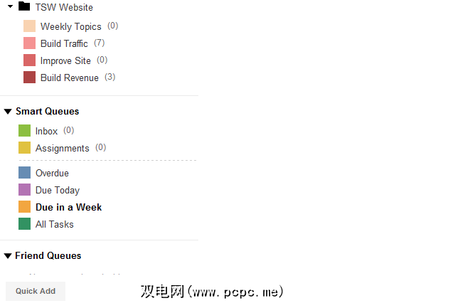 GQueues的真正优点可以在左侧导航区域的底部-一个名为 Smart Queues 的区域。该区域会根据您为任务设置的截止日期自动更新。它的作用是防止您从现在开始一周左右设置到期日期,然后忘记所有相关内容,直到到期日期到来并收到Google日历提醒。