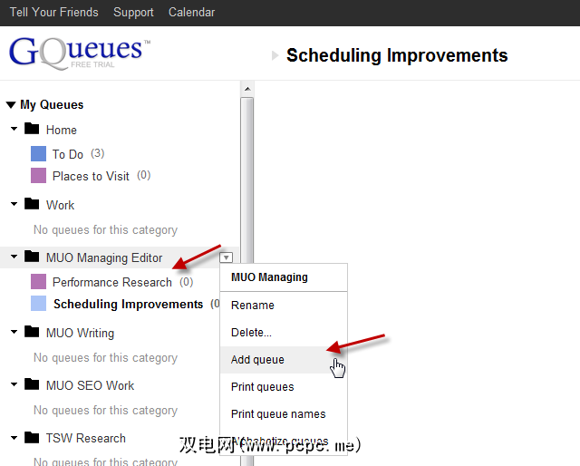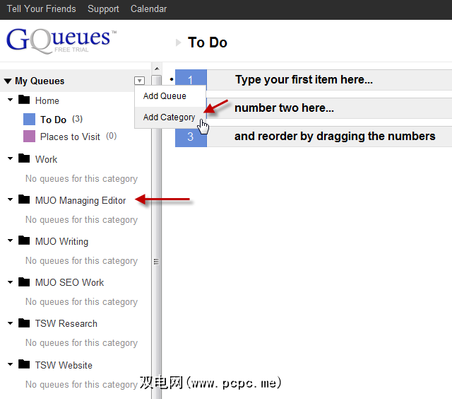您可以使用下一个下拉列表创建这些“文件夹"转到“我的队列",然后单击“添加类别"。要在这些文件夹下创建单独的任务列表,只需单击该类别名称旁边的下拉列表,然后单击“添加队列"。