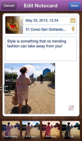 该应用程序甚至包括可通过轻按即可应用的类似Instagram的照片滤镜。照片的日期戳也可以在记事卡中更改。