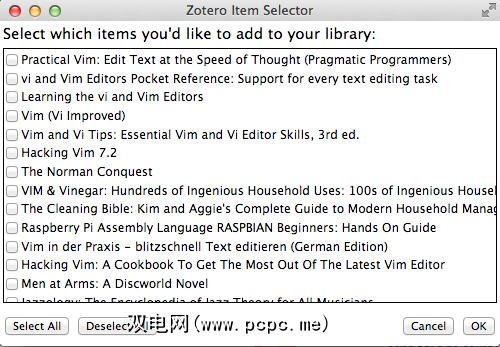 亚马逊也是如此。搜索一本书,然后单击地址栏中的小图标。 Zotero将允许您选择要为其生成参考的结果。
