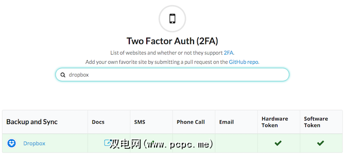 该网站列出了所有支持2FA的网站。您可以按类别浏览它们,或使用搜索栏。它通过SMS,电子邮件,电话或其他应用程序显示每个站点的辅助密码令牌的方法。点击该网站的名称即可直接启用2FA。