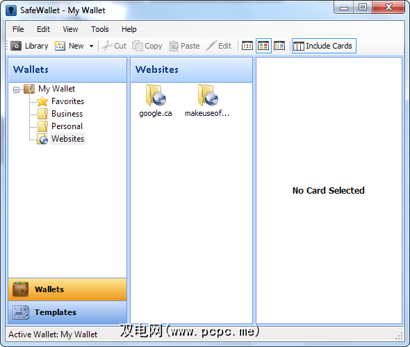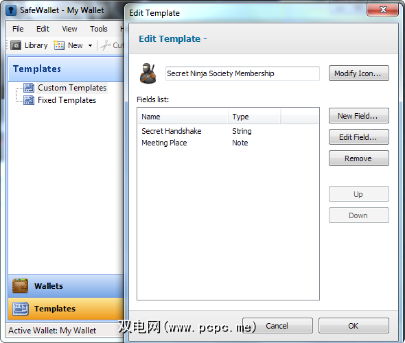 一个简洁的功能是可以创建自己的模板。如果要添加不适合现有模板的信息,请单击窗口底部的 Templates 选项,然后使用 New 菜单并选择模板。以创建和自定义新模板。您的自定义模板以及SafeWallet的默认模板将在 New -> Card 窗口中提供。