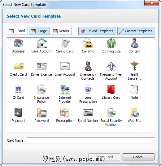SafeWallet不仅限于密码。使用 New -> Card 选项,您会看到用于其他类型信息的模板列表。无论您要添加信用卡,序列号还是只是便条,您都可以在此处找到模板。