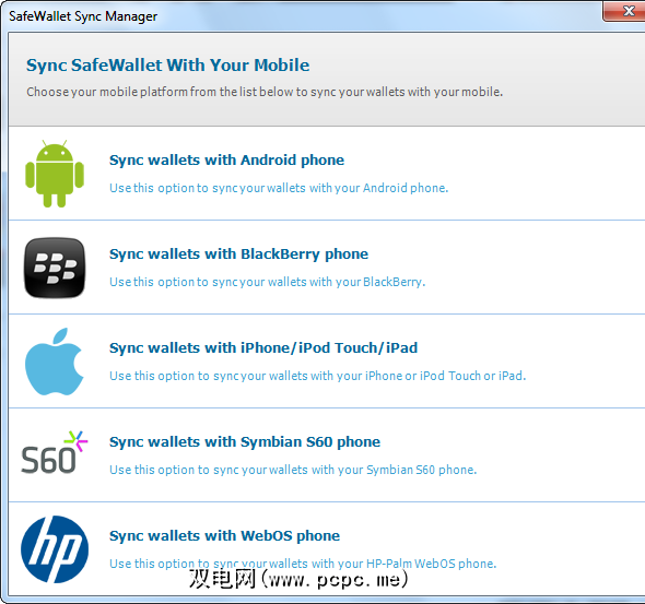 SafeWallet包含应用适用于iOS,Android,BlackBerry,Symbian和WebOS设备。如果您已经在使用桌面应用程序,则可以使用基于云的Dropbox同步或通过USB电缆或Wi-Fi进行本地同步来跨设备同步钱包。