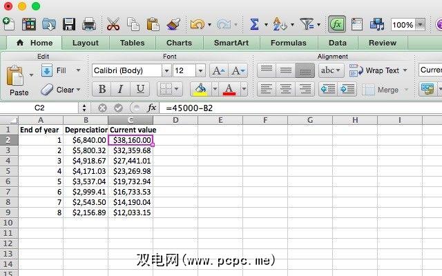 “折旧"列中的数字是所损失的价值量。因此,要查看该年末的投资价值,您需要从该年年初的投资价值中减去“折旧"列中的数字。