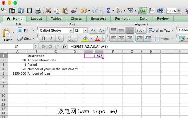 =ISPMT(.05, 1, 20, 250000)在Excel中运行时,您会得到$ 11,875的结果(如您所见,我已经设置好了作为表格并从中选择值。)