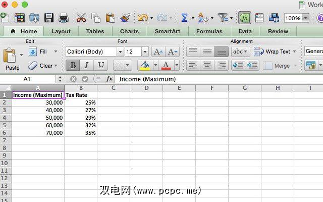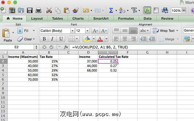 =VLOOKUP(A2, A1:B6, 2, TRUE)A2 是收入金额, A1:B6 是包含税率的单元格范围,数字2表示我们要返回第二列中的值,而TRUE告诉公式,如果找不到完全匹配的内容,则应四舍五入。