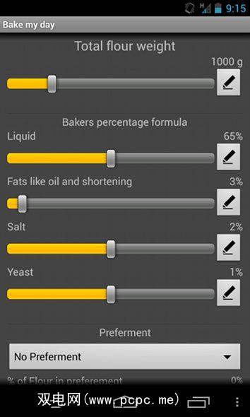 最后但并非最不重要的是“烘烤我的一天",该应用程序专门用于帮助人们创建面包食谱。这可能是此列表中互动性最强的应用之一,因为您可以调整配方的许多不同参数。这些参数包括面粉总重量,液体百分比,脂肪百分比,盐百分比,酵母百分比,偏好和偏好中面粉的百分比。