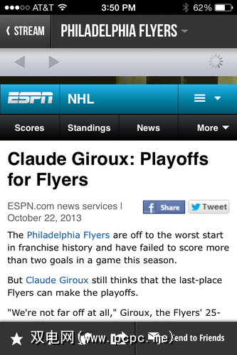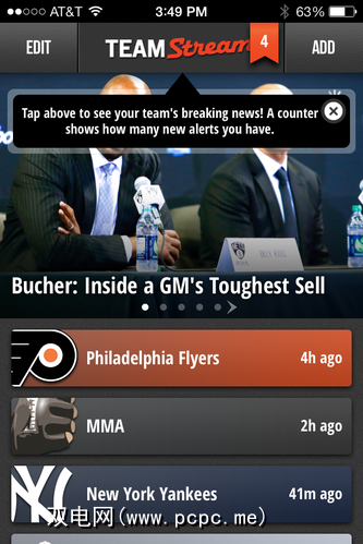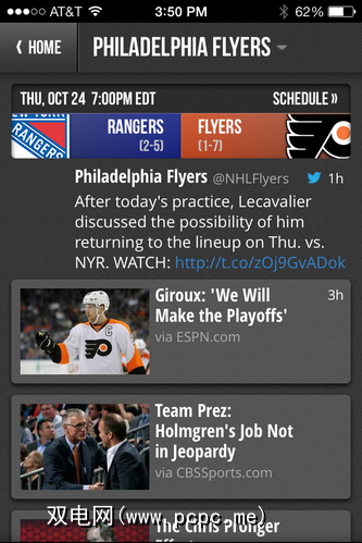 您可以单击您关注的任何团队以查看有关它的所有近期商店。因此,如果我想知道“费城飞人队"(我最喜欢的NHL团队)在做什么,我可以单击它。令人震惊的是,我很可能会发现他们继续输掉比赛,但这既不是这里也不是那里。