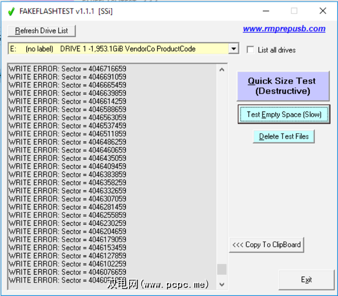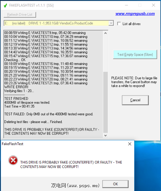 为确保您拥有假冒的闪存,您可以运行诸如FAKEFLASHTEST之类的工具,并注意以下错误: