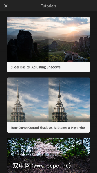 指导教程:启用它并转到Lr图标下的帮助和支持。现在有四篇简短而精确的教程,它们为您演示了可以在Lightroom中完成的一项特定任务。