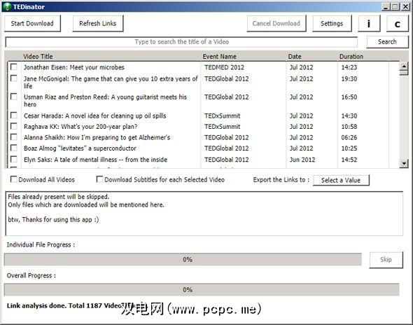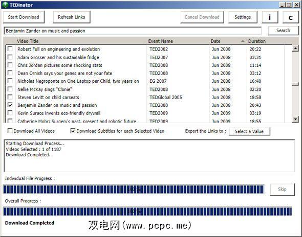 顾名思义,TED Downloader使得下载轻轻松松的实际行为成为现实。只需在要下载的视频旁边标记一堆复选框,然后单击“ 开始下载。"。它们将开始一个接一个地下载。而已!如果您想要字幕,则需要启用“ 下载字幕"复选框,它会自动发生。